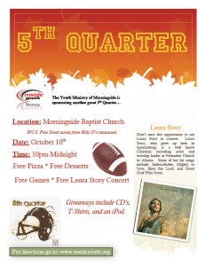 In less than two weeks we’ll be having another great 5th Quarter at Morningside. This year we’ll be hosting the 5th Quarter in the newly renovated Youth Room with a special concert by recording artist and worship leader, Laura Story. There will be games and free food in the Welcome Center starting at 10pm and the concert will begin upstairs in the youth room at 11pm. We still need volunteers to chaperon and supply desserts for the event as well as help set up and clean up. If you’re a parent who wants to help, or just a church member who would like to lend a hand – please let me know. This will be a great outreach to the students in our area after high school football games.