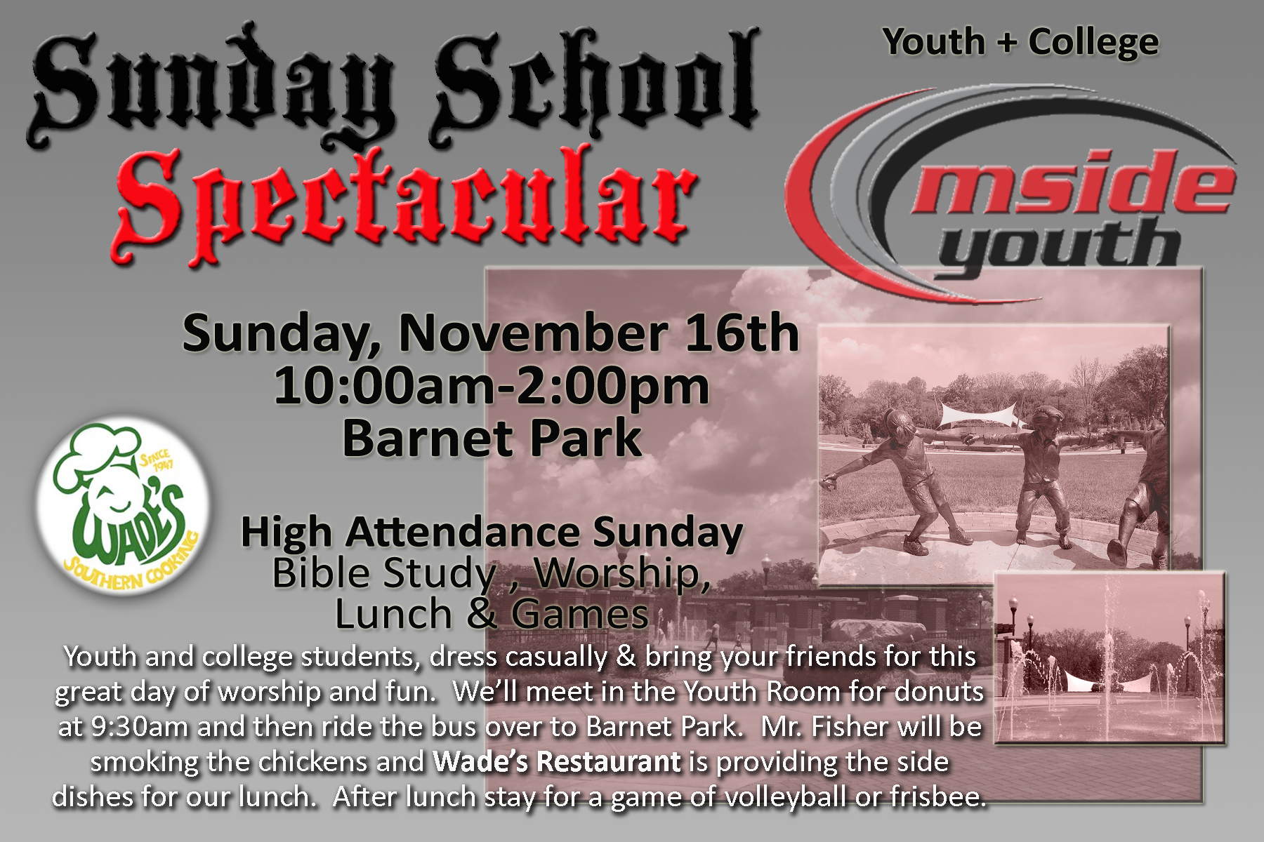 This Sunday is our big High Attendance Day at Morningside. All youth and college students are invited for a great day of Bible Study, Worship, Wade’s Lunch & Games at Barnet Park. Rain, snow, cold, or whatever – we’re still having it. If the weather is bad – we’ll have an alternate location. Come to the church at 9:45am and we will go from there. Invite your friends – see you all on Sunday!