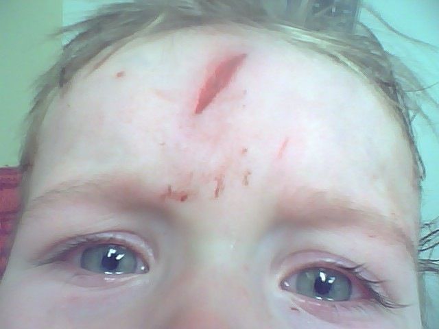 Tonight Ellis had his first ER visit. As we were leaving his classroom tonight after church, he fell in the hallway and busted his forehead open when he hit a door frame. Honestly, it was hard to believe he was bleeding so much and I was in a little bit of shock. I just covered his head to stop the bleeding, got in the car and had a friend drive us to the hospital. We had a great doctor stitch him up (thanks Dr. Ross for helping us get a great surgeon on a sunday night). Ellis was such a good little boy and was very brave. I’m not sure how many stitches he has, but I would say about 10 or more. Were home now and ready for a few days that are less eventful than strep throat and busted heads. Here’s a picture from my cell phone of the cut after the bleeding stopped but before the stitches.
