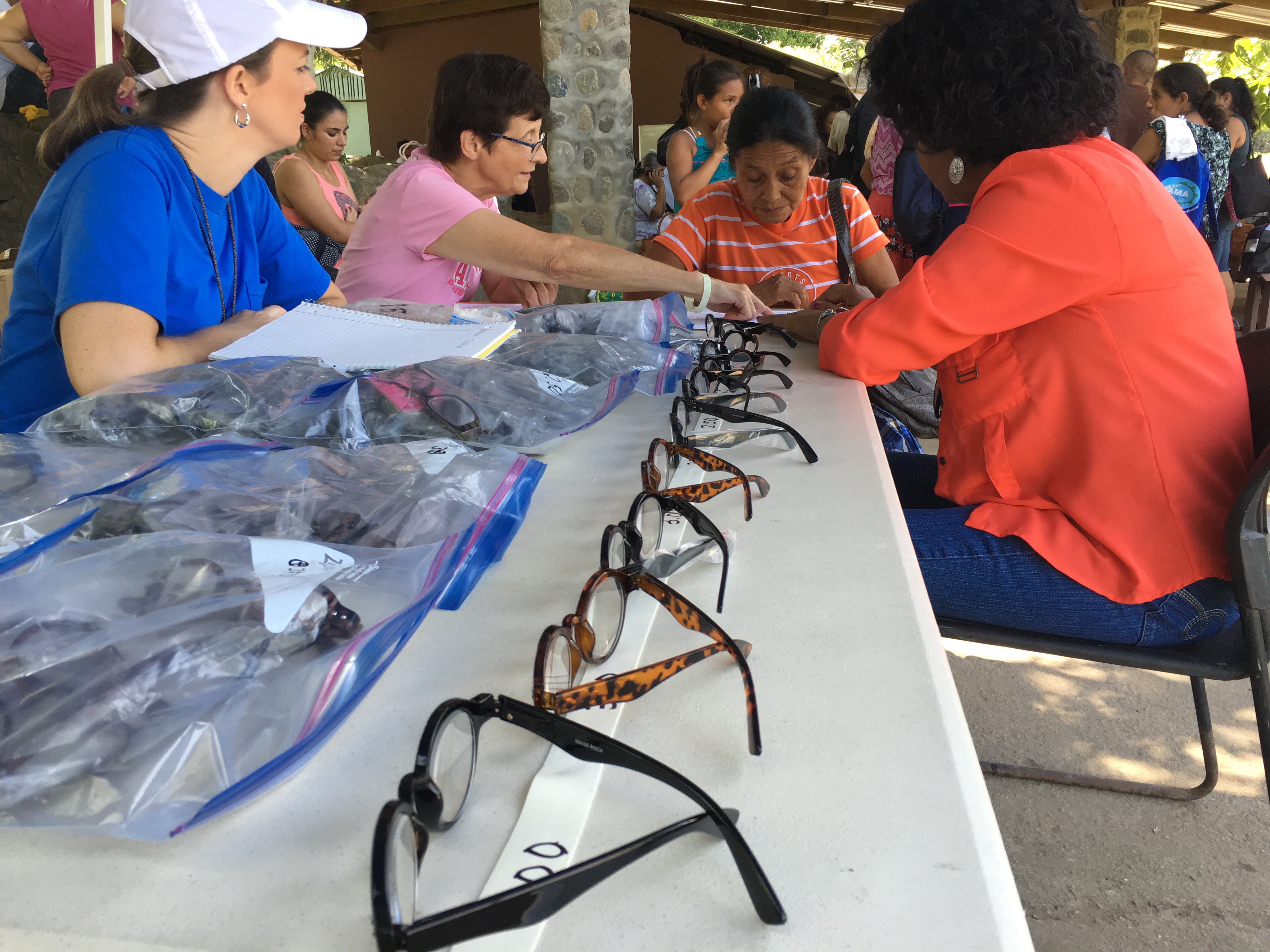 Today all 44 members of our mission team plus our translators loaded up and headed to Bel Aire for the day. Marci and I worked the optical station – along with our translator Harriet Kelly. Finding the right glasses for people who need them is a challenge – especially when they can’t read and we don’t have eye charts like we do at home! We have John 3:16 written in different size font and the different sizes correspond to different strengths of reading glasses! However the neat thing about optical is asking people if they can see Jesus with their hearts! Three men and one woman accepted Christ today. The last man kept saying he was good and could get to heaven because he was good. Brad Kempson was standing nearby and heard him! Brad joined the conversation and shared his testimony with the man who then accepted Christ!!!!